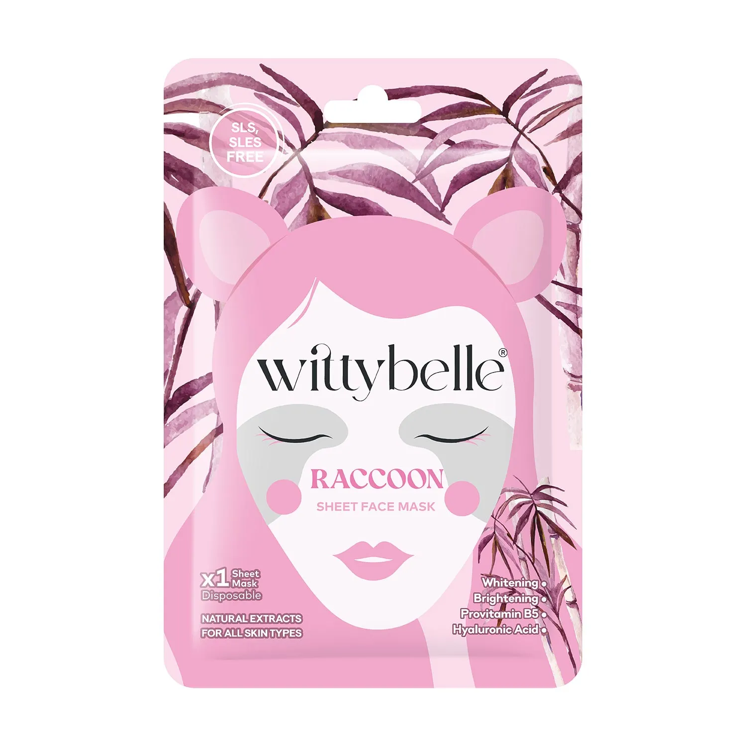 Η Wittybelle Raccoon Sheet Face Mask φωτίζει και εξομαλύνει τον τόνο του δέρματος με εκχυλίσματα γλυκόριζας και γκρέιπφρουτ.
